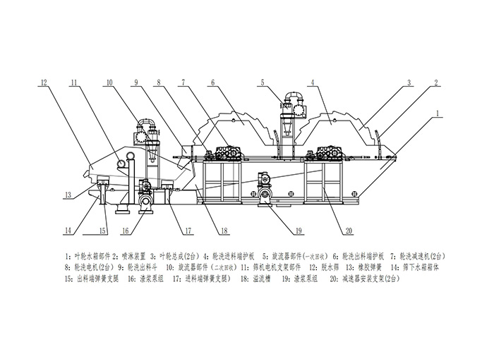 雙輪洗沙回收一體機(jī)由兩臺(tái)洗沙輪、儲(chǔ)水槽、抽水槽、反水裝置、溢流裝置、分離回收裝置、脫水裝置、減速機(jī)、水泵、電機(jī)等部件組成。