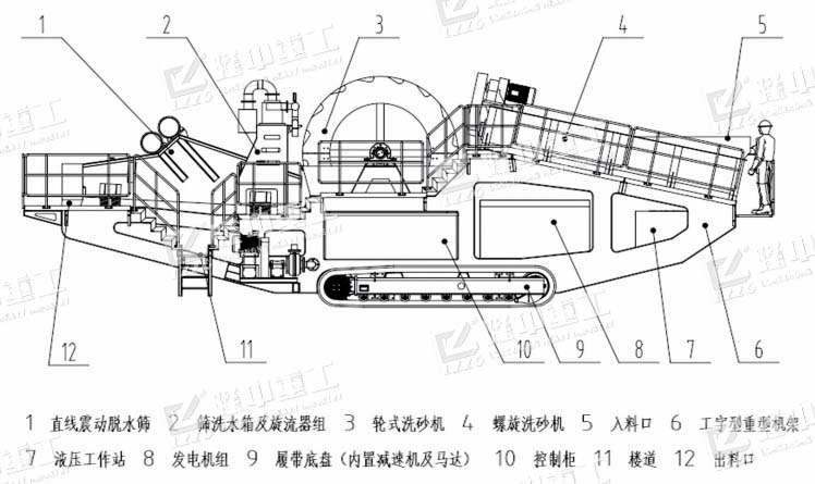 結(jié)構(gòu)組成:履帶式移動(dòng)洗砂機(jī)由篩分裝置、水洗裝置、脫水回收裝置、泵及電機(jī)組件、傳送皮帶、電控及液壓系統(tǒng)等組成。