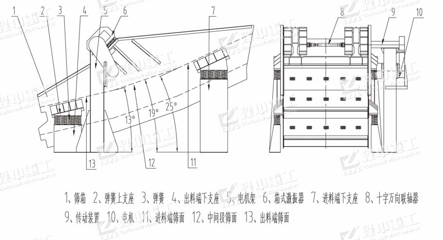 香蕉振動篩是由電動機(jī)和激振器作為振動源,激振器主要是由偏心軸、皮帶輪、軸承及軸承座等組成,激振器安裝在篩箱側(cè)板上,并由電動機(jī)通過三角皮帶或軟連接與其相連,電動機(jī)帶動偏心軸旋轉(zhuǎn),產(chǎn)生離心慣性力,迫使篩箱振動。香蕉篩篩箱運(yùn)動軌跡為橢圓,同時篩面有較大的傾角(20°),物料從入料端落入篩網(wǎng)后在振動力的作用下迅速前進(jìn)、松散透篩,完成篩分作業(yè)。
