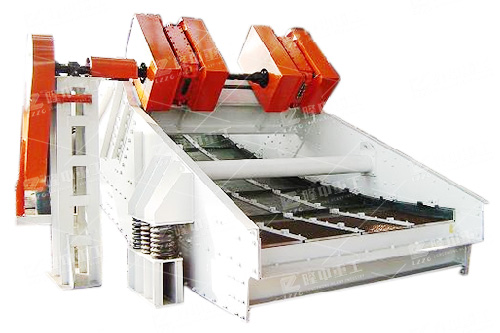 香蕉振動篩在入料端有一斜坡面,先以34°開始,緊接著角度下降到大約為10°的出料端為止。篩面采用不同傾角的折線形式,從入料端到出料端物料層厚度是不變。各段篩面上物料量與流速比值穩(wěn)定、料層較高,呈現(xiàn)均勻狀態(tài)篩分效率顯著提高,比相同有效面積篩分機(jī)的處理量提高1-2倍,對于細(xì)粒含量高,特別是物料中料度占分級粒度尺寸小于1/2的物料含量較大時,香蕉型振動篩分機(jī)具有較高的篩分效率。